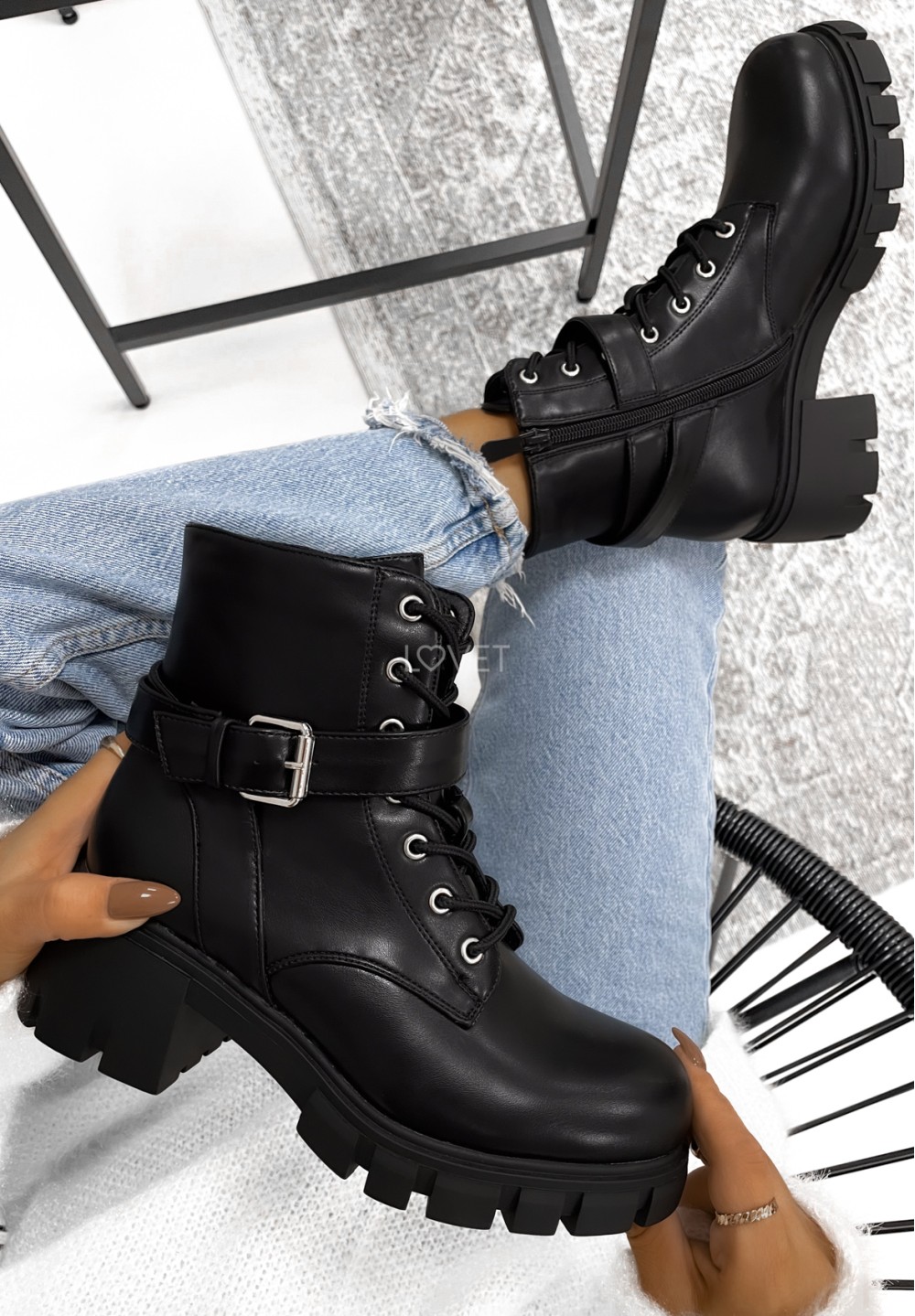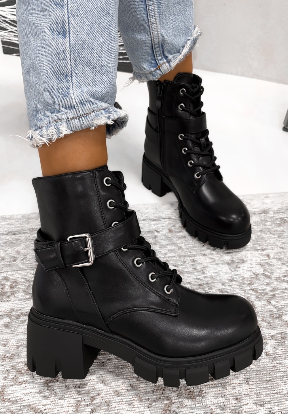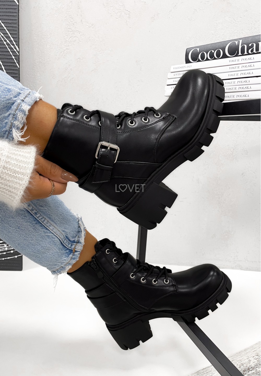 Elementem ozdobnym butów jest pasek z zapinaną klamrą.