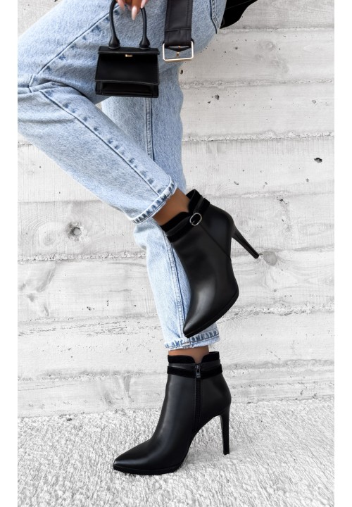 Stylowe i kobiece – te czarne botki to doskonały wybór dla miłośniczek elegancji z nutą nowoczesności. Smukły nosek w szpic pięknie wysmukla stopę, a wysoki obcas typu szpilka dodaje sylwetce lekkości i wdzięku. U góry cholewki znajduje się cienki, zamszowy pasek z ozdobną klamerką, który nadaje butom subtelnego uroku. Górne wykończenie z miękkiego zamszu podkreśla ich wyjątkowy charakter i dodaje im klasy. To model, który idealnie sprawdzi się zarówno na co dzień, jak i na wyjątkowe okazje – perfekcyjny do sukienek, spódnic oraz eleganckich spodni.