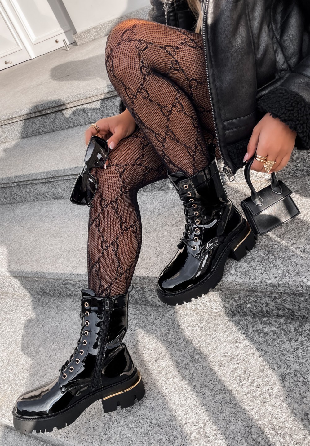 Stylowe czarne botki w traperowym stylu to połączenie mocy i elegancji. Wykonane z wysokiej jakości lakierowanej skóry ekologicznej, przyciągają wzrok subtelnym połyskiem i modnym wykończeniem. Klasyczne sznurowanie pozwala idealnie dopasować but do stopy, a solidna, traperowa podeszwa zapewnia wygodę i stabilność na każdym kroku. Idealne do jesienno-zimowych stylizacji – dodadzą charakteru zarówno kobiecym, jak i bardziej casualowym zestawom.