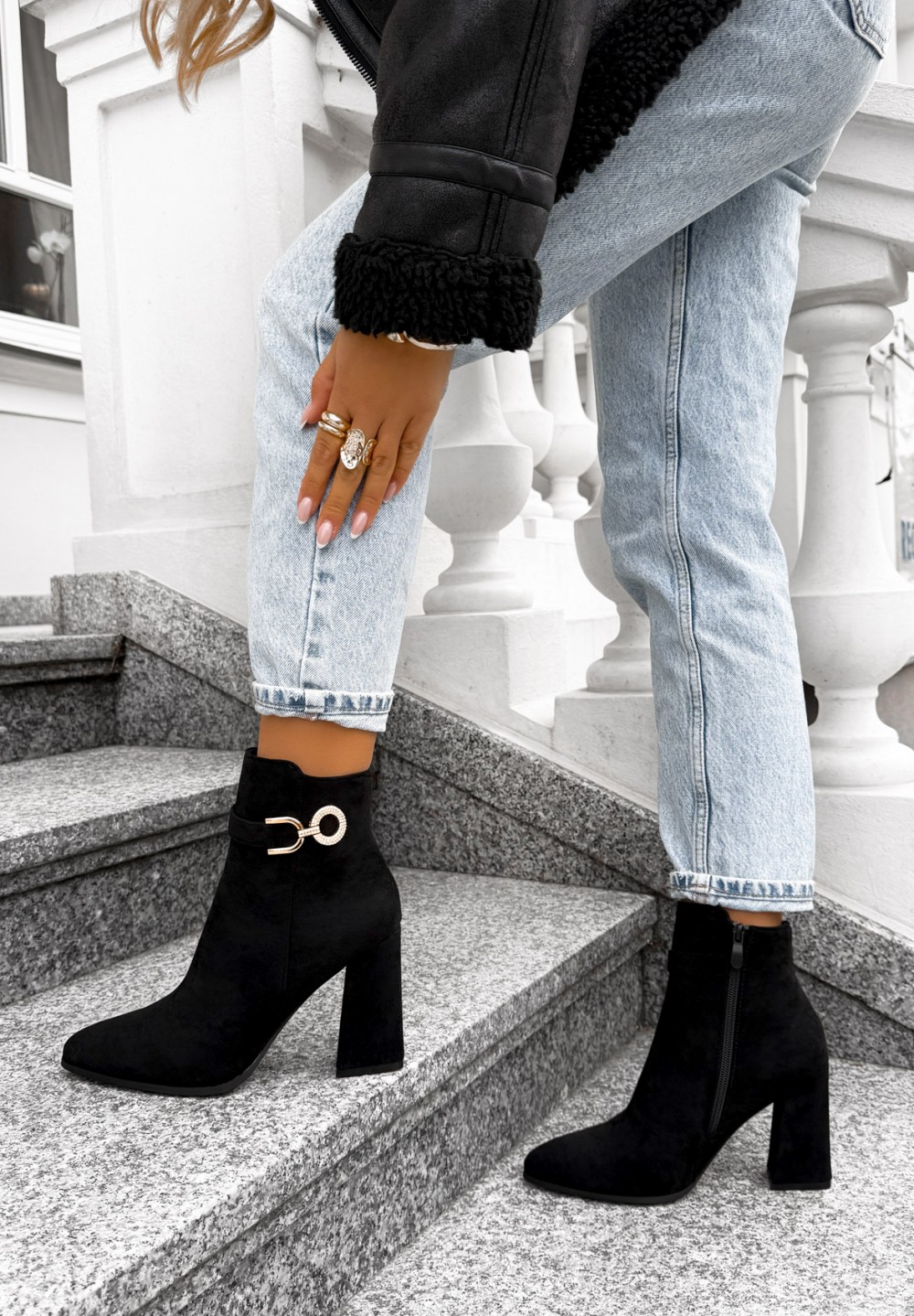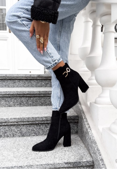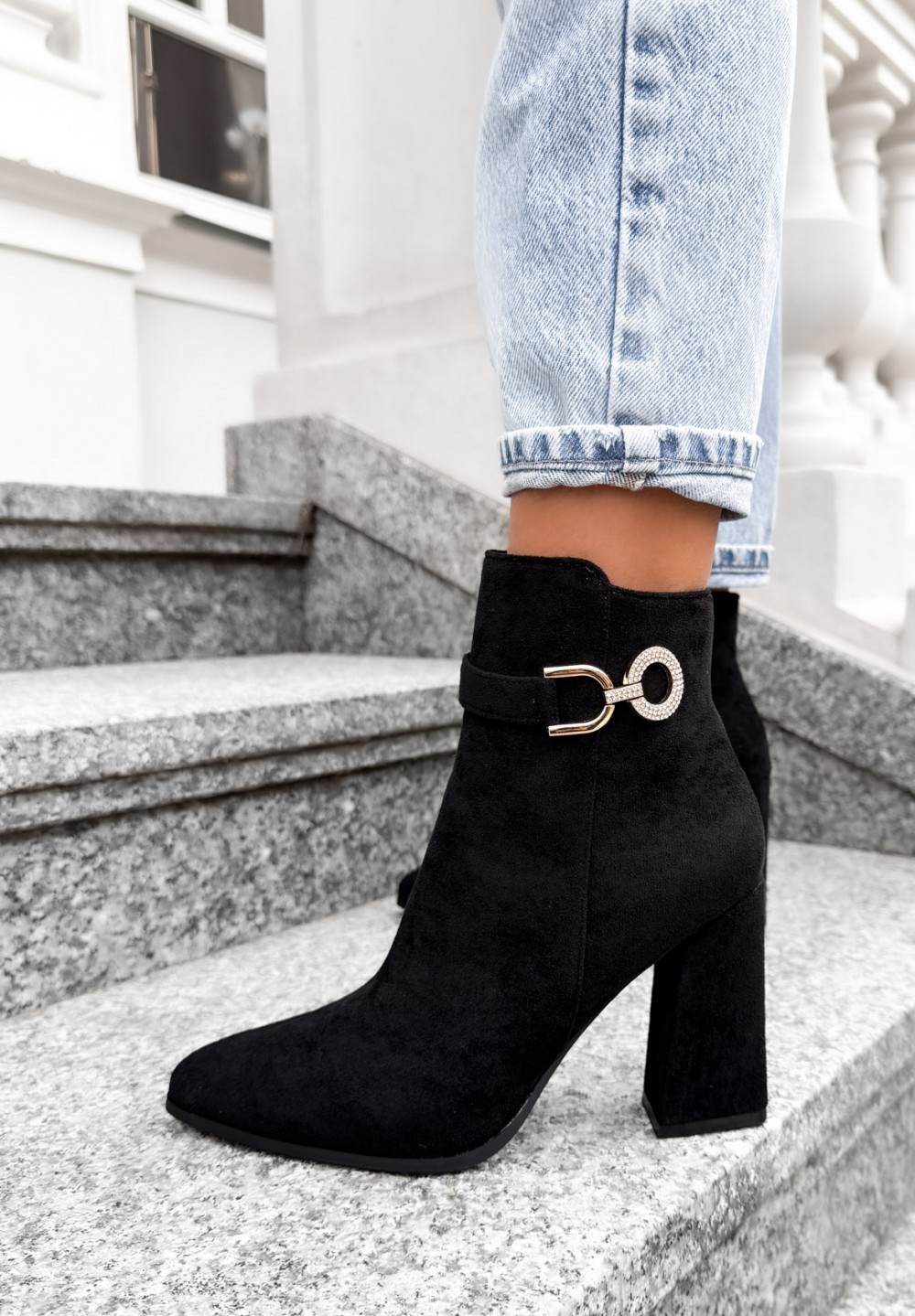 Eleganckie czarne botki wykonane z miękkiego eko zamszu to połączenie klasyki i subtelnego blasku. Model osadzony jest na stabilnym obcasie typu słupek, z noskiem w szpic, co wysmukla stopę i nadaje sylwetce lekkości. U góry cholewki znajduje się cienki pasek, na którym z boku umieszczono złotą ozdobę wysadzaną cyrkoniami, dodającą butom eleganckiego i kobiecego charakteru. Idealne do codziennych i eleganckich stylizacji – doskonale komponują się zarówno z sukienkami, jak i spodniami.
