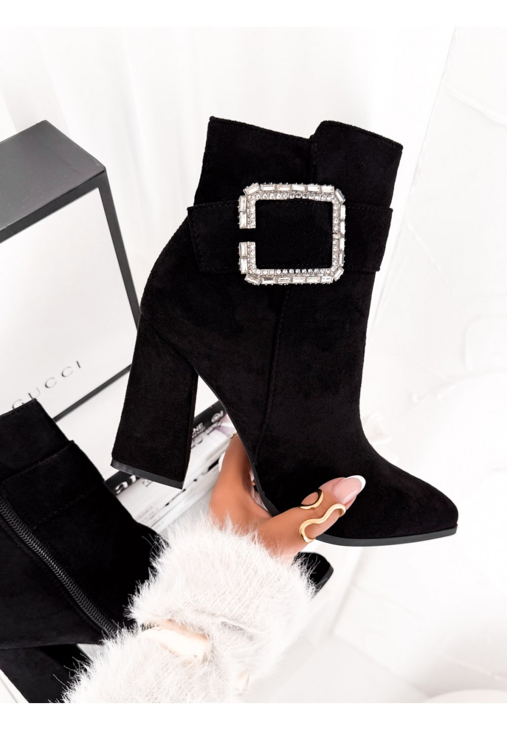 Stylowe i kobiece – te czarne botki z eko zamszu to idealny wybór dla miłośniczek elegancji i wygody. Klasyczny fason został urozmaicony subtelnym detalem – ozdobnym paskiem z regulowaną klamrą w kolorze srebra, umieszczoną u góry cholewki. To właśnie ten akcent nadaje butom wyjątkowego charakteru i delikatnego blasku. Stabilny słupek zapewnia komfort noszenia przez cały dzień, a miękki eko zamsz doskonale dopasowuje się do stopy, dodając stylizacji lekkości i szyku. Idealne do sukienek, spódnic, ale też dopasowanych spodni – sprawdzą się zarówno na co dzień, jak i na wyjątkowe okazje.