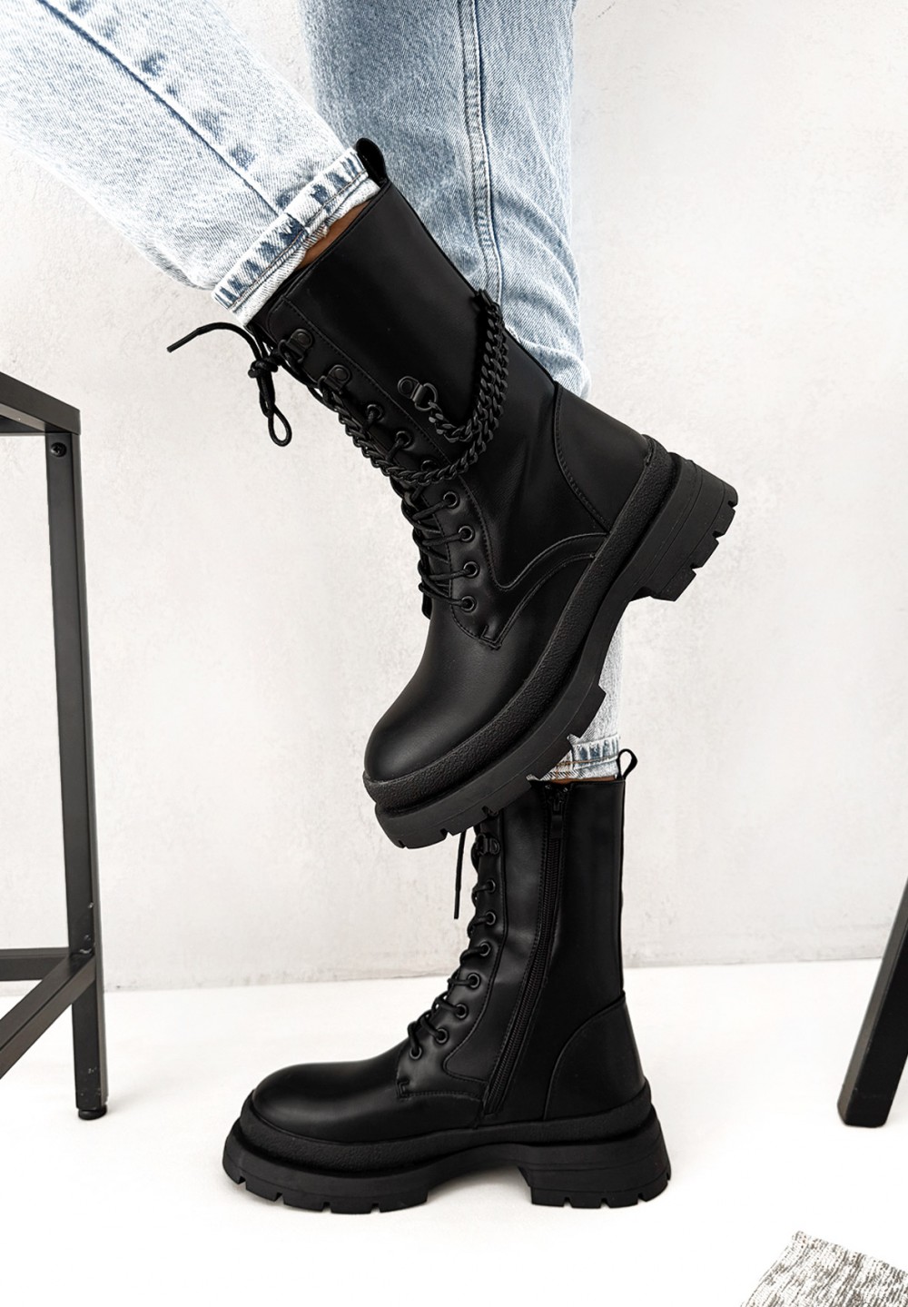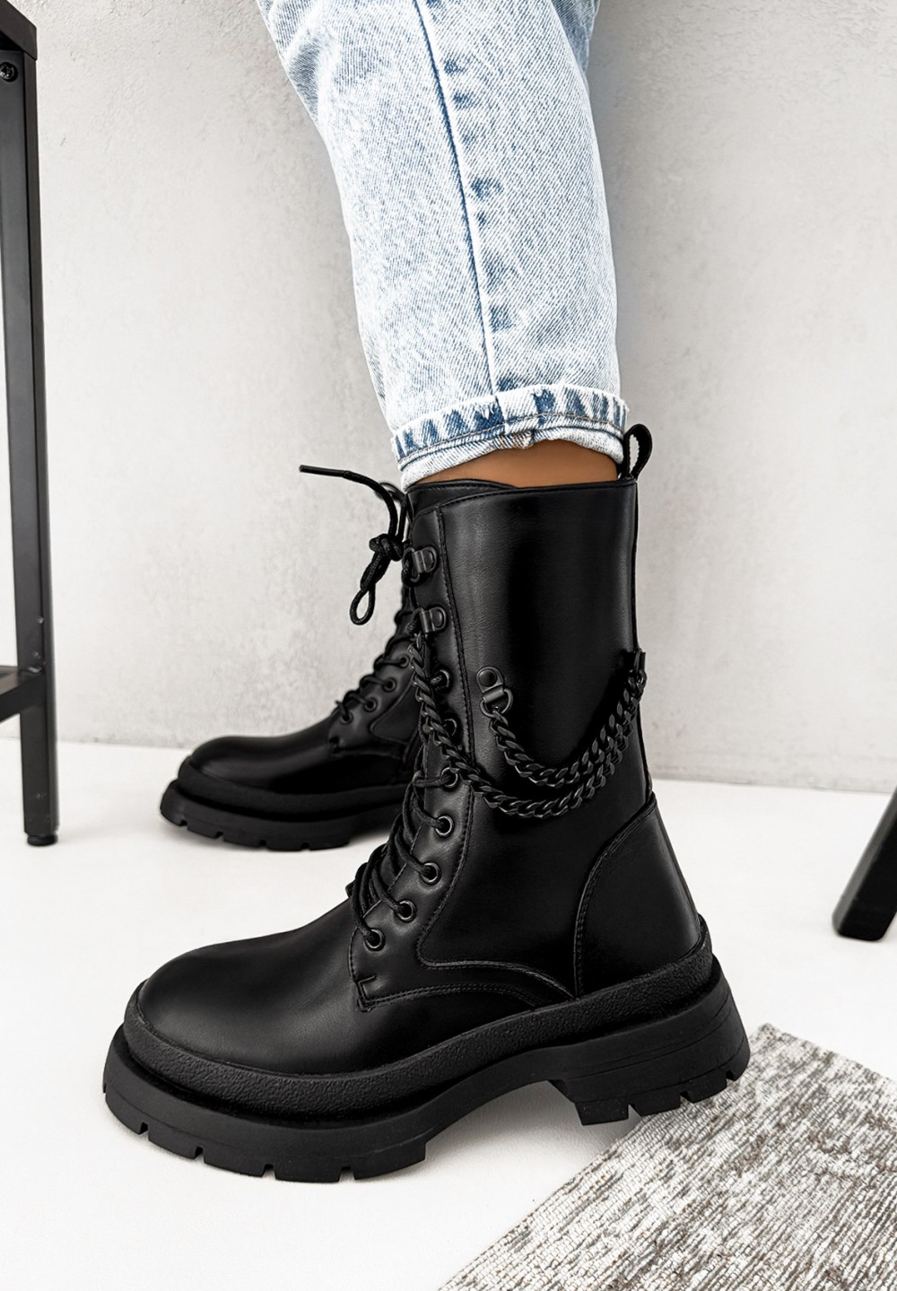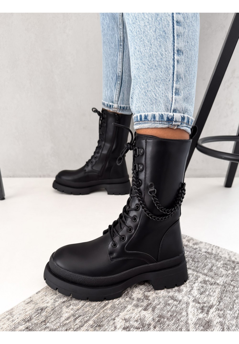 Te czarne botki-trapery to połączenie miejskiego stylu i odrobiny rockowego pazura! Wykonane z wysokiej jakości materiału, prezentują się solidnie i nowocześnie. Klasyczne wiązanie pozwala na idealne dopasowanie do stopy, a praktyczny suwak z boku ułatwia zakładanie i zdejmowanie butów. Czarny łańcuch umieszczony z boku cholewki dodaje całości wyjątkowego charakteru i sprawia, że buty wyróżniają się w każdej stylizacji. Stabilna, traperowa podeszwa gwarantuje wygodę i pewność kroku niezależnie od pogody.