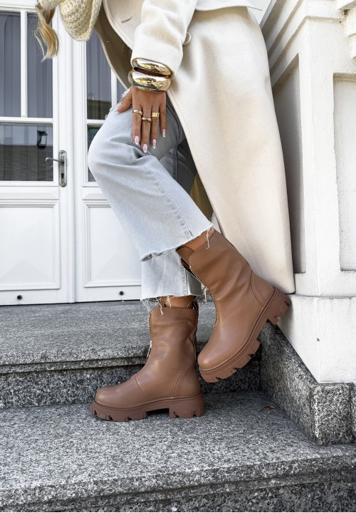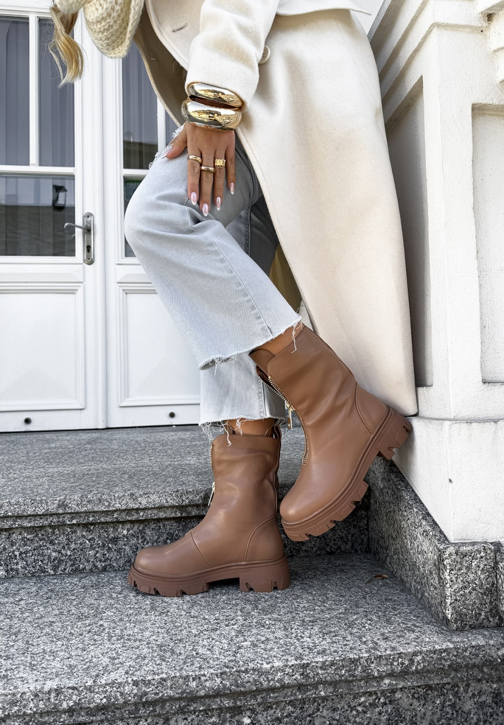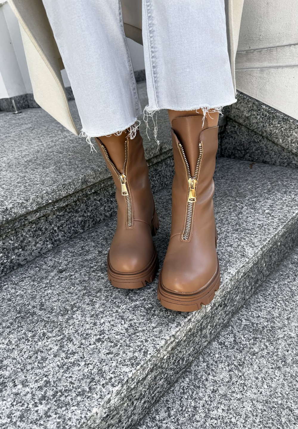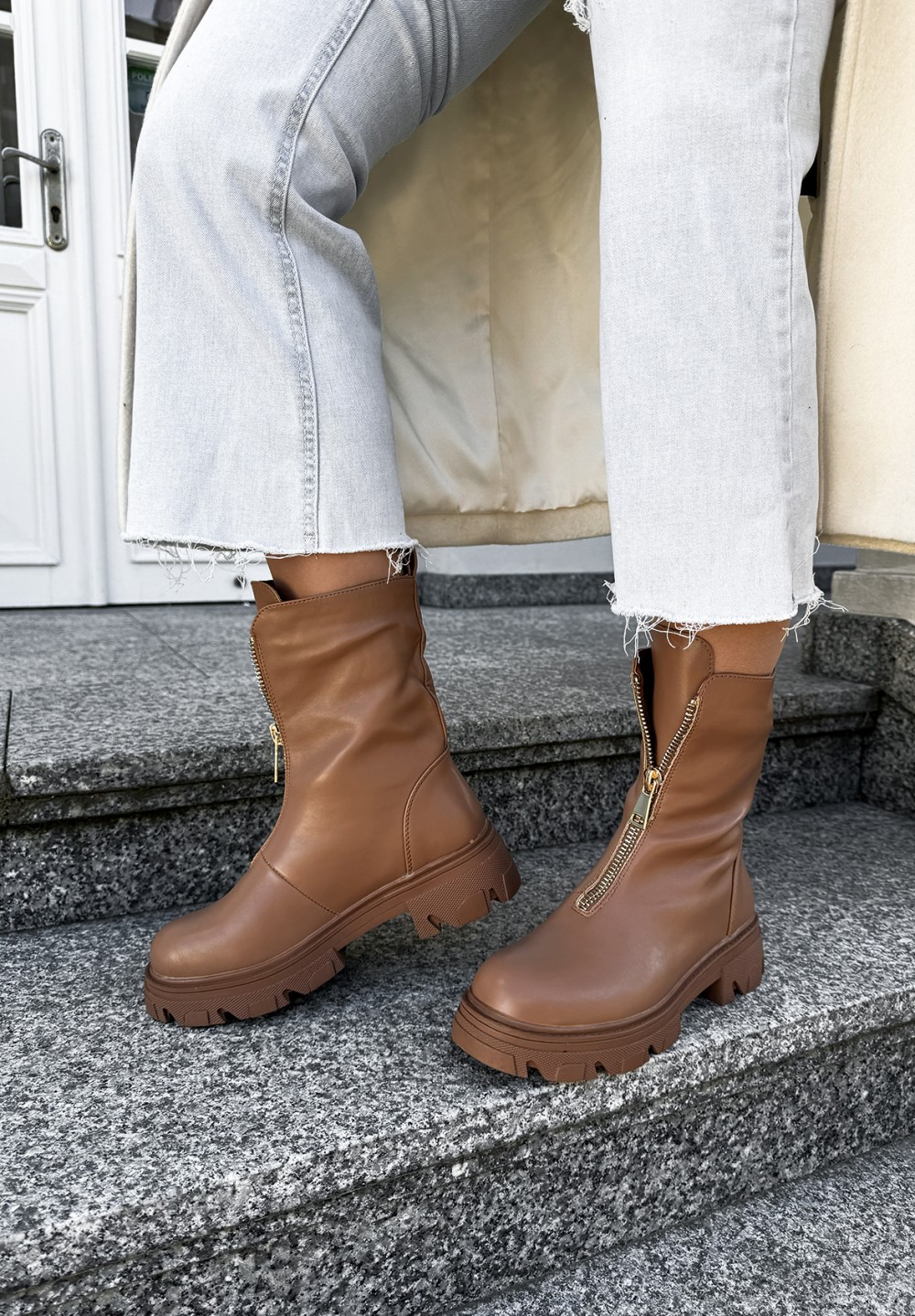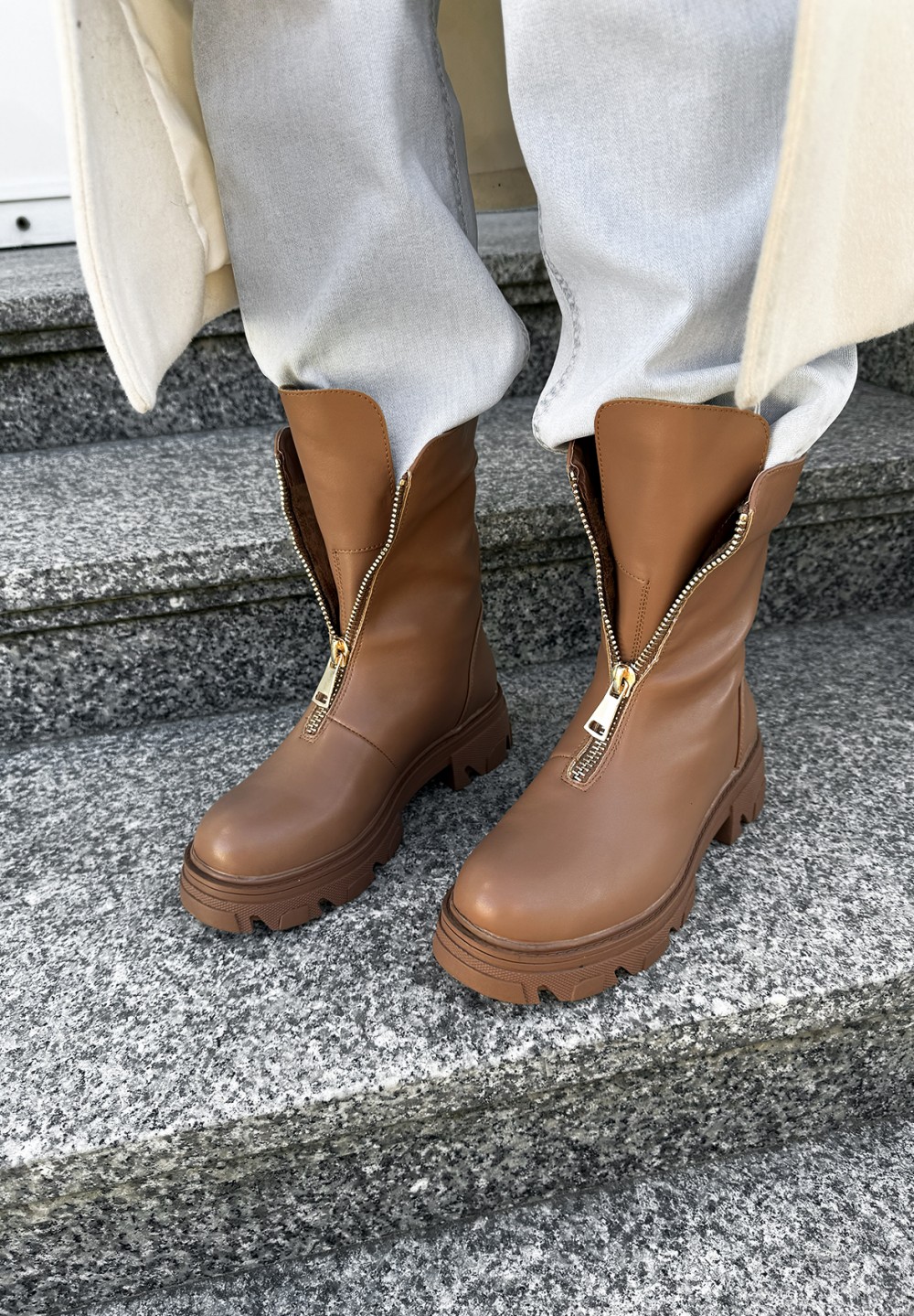 Odkryj wyjątkowe botki w kolorze jasnego brązu, które łączą w sobie styl, wygodę i funkcjonalność. Ich solidna, traperowa podeszwa zapewnia pewność kroku na każdej nawierzchni, a złoty suwak umieszczony z przodu nie tylko nadaje im nowoczesnego charakteru, lecz także ułatwia szybkie zakładanie i zdejmowanie butów. Wnętrze botków wypełnione jest mięciutkim, przyjemnym w dotyku futerkiem, które otula stopę ciepłem nawet w chłodniejsze dni. To idealny wybór dla osób ceniących sobie komfort i stylowy wygląd w jesienno-zimowym sezonie.