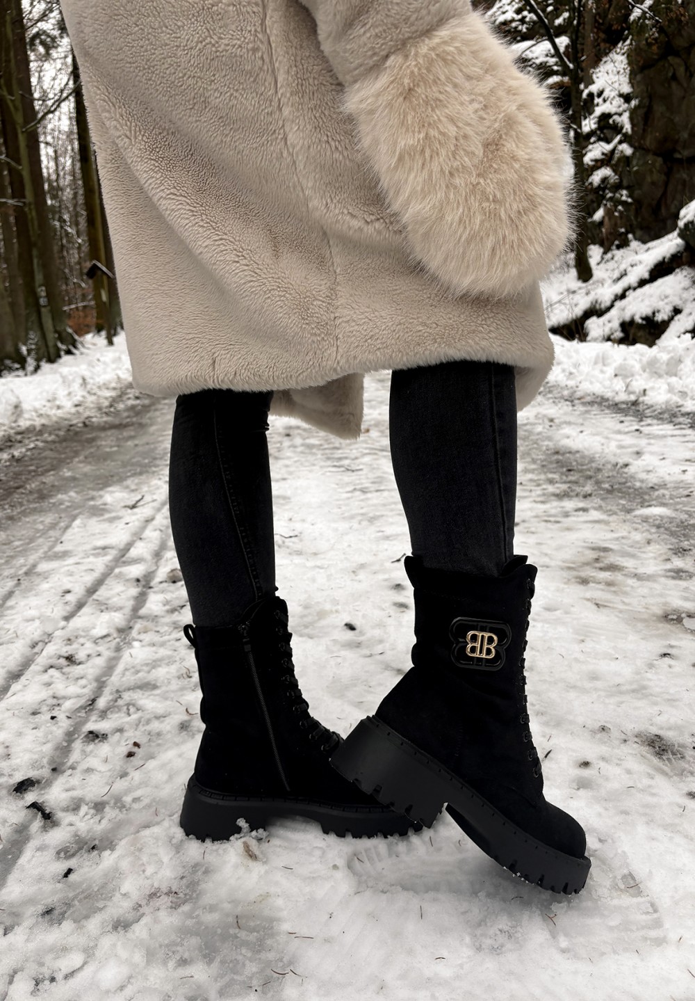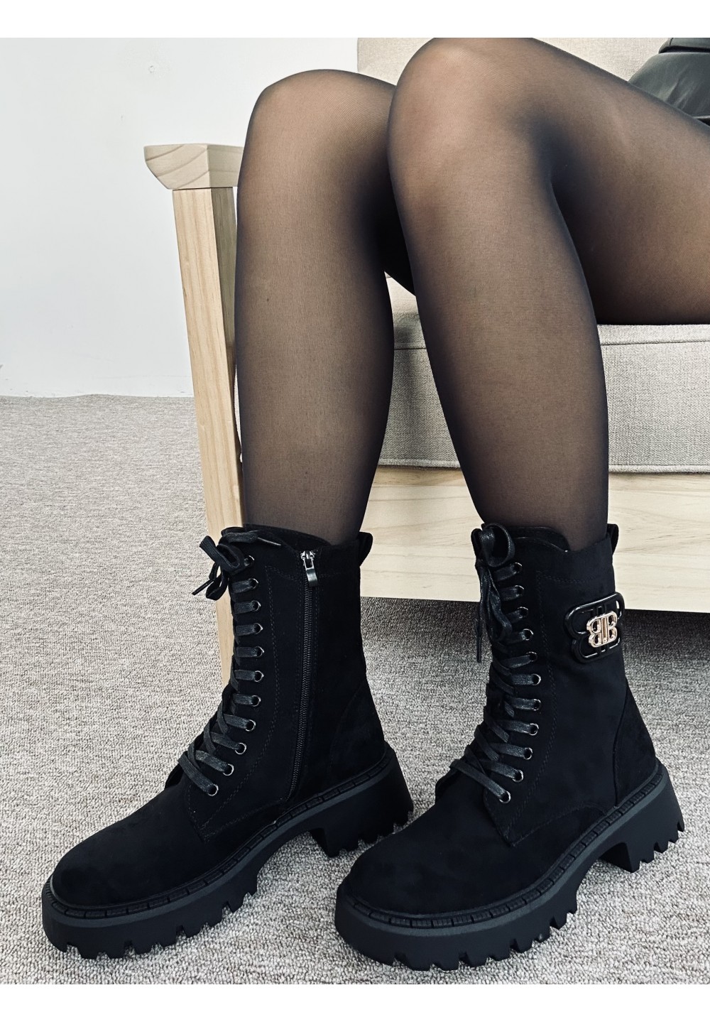 Eleganckie, czarne botki sznurowane o militarnym charakterze, wykonane z miękkiego, matowego materiału o zamszowej fakturze. Wyposażone w wyrazistą, masywną podeszwę zapewniającą stabilność oraz boczny zamek ułatwiający zakładanie. Metalowa ozdoba po boku dodaje modelowi nowoczesnego, stylowego akcentu. Idealne do miejskich, jesienno-zimowych stylizacji – łączą wygodę, trwałość i modny design.