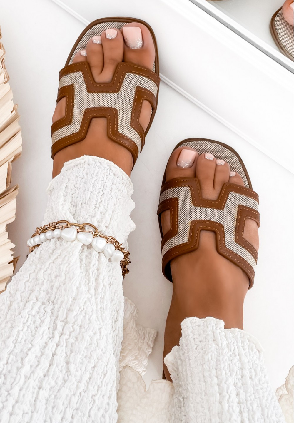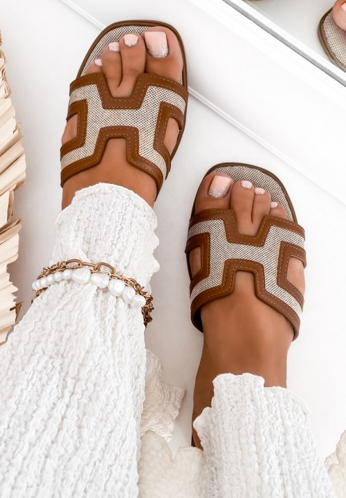 Lniane klapki z wycięciem w kształcie litery "H" – beżowe detale, naturalny styl
