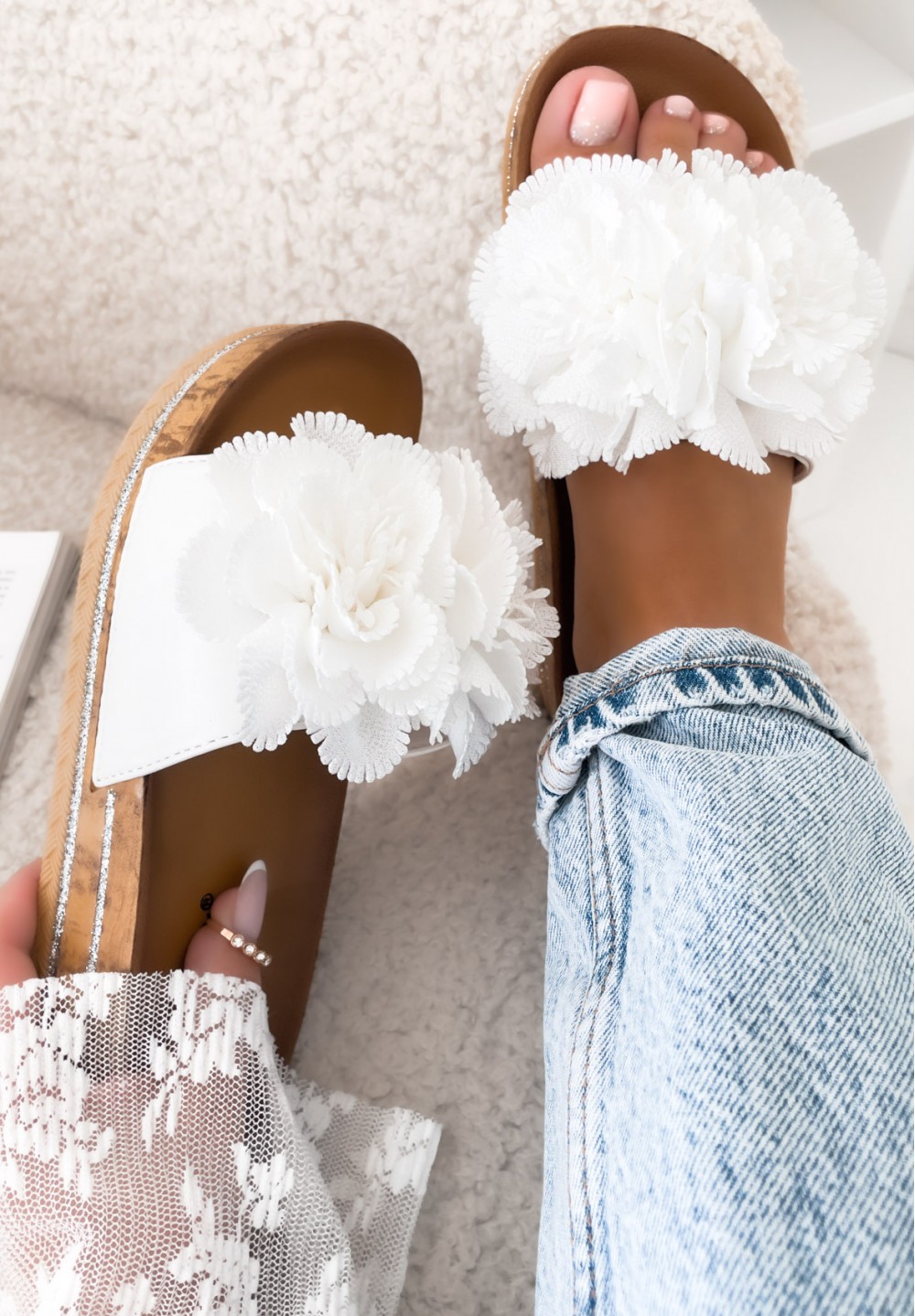 Wprowadź do swojej garderoby odrobinę elegancji z nutą błysku! Te białe klapki na platformie to stylowe i wygodne rozwiązanie na letnie dni. Ich minimalistyczny design przełamują efektowne, białe kwiaty umieszczone na pasku, dodające całości subtelnego, kobiecego charakteru. Delikatne cyrkoniowe wstawki w podeszwie przyciągają wzrok i pięknie mienią się w słońcu.