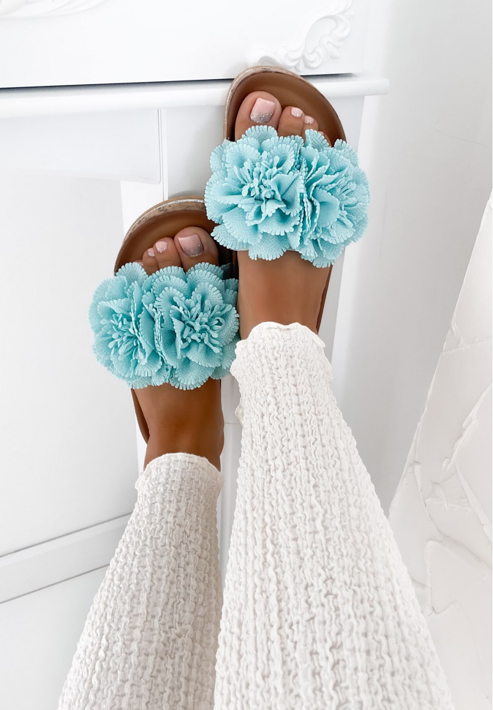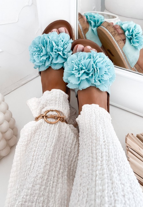 Wprowadź do swojej garderoby odrobinę elegancji z nutą błysku! Te czarne klapki na platformie to stylowe i wygodne rozwiązanie na letnie dni. Ich minimalistyczny design przełamują efektowne, błękitne kwiaty umieszczone na pasku, dodające całości subtelnego, kobiecego charakteru. Delikatne cyrkoniowe wstawki w podeszwie przyciągają wzrok i pięknie mienią się w słońcu.