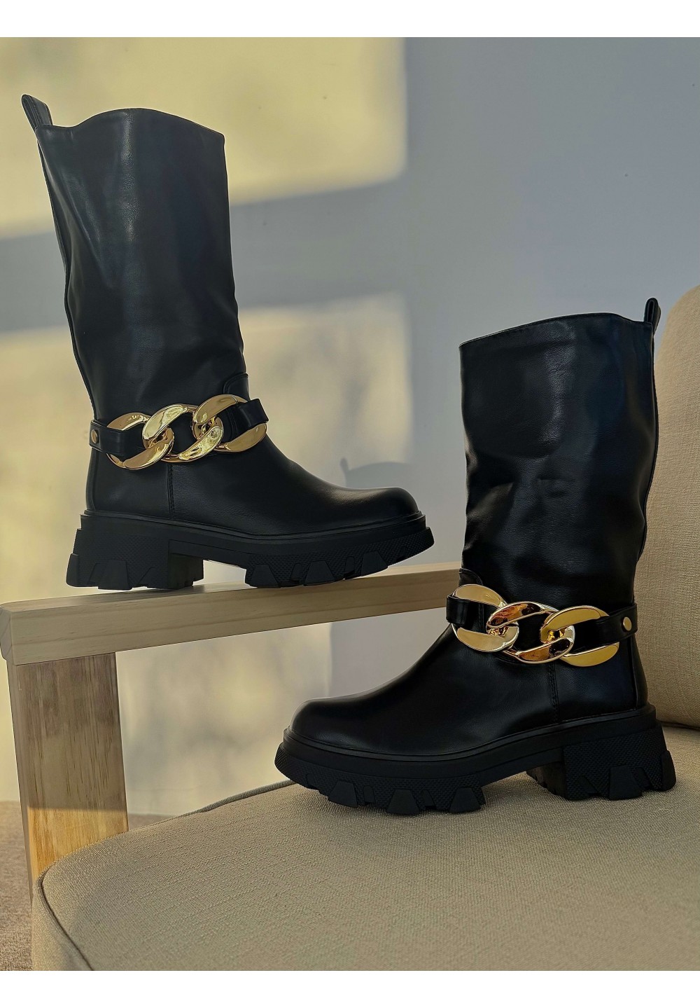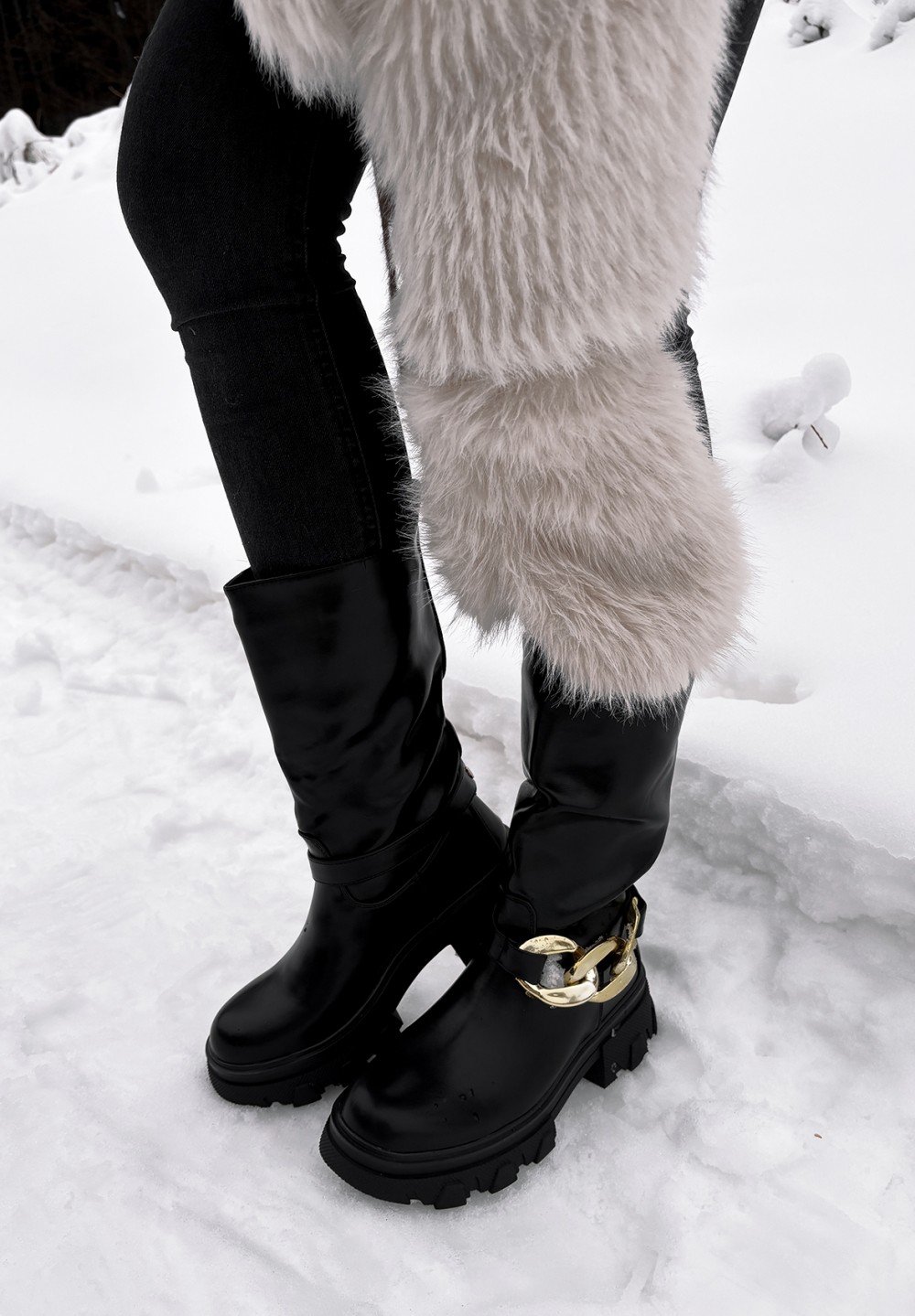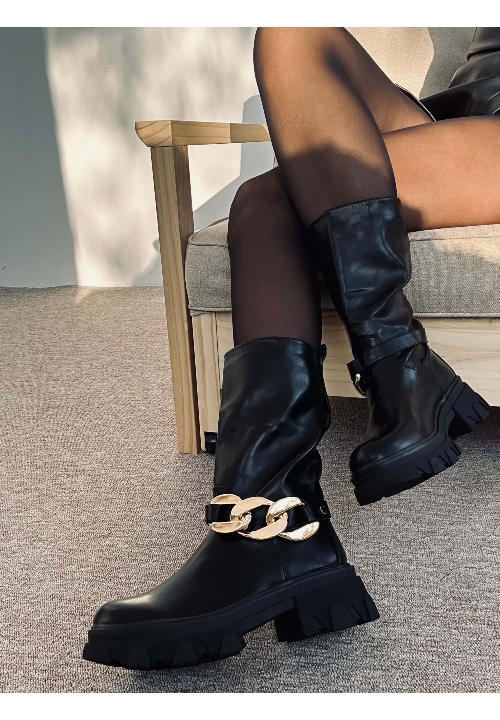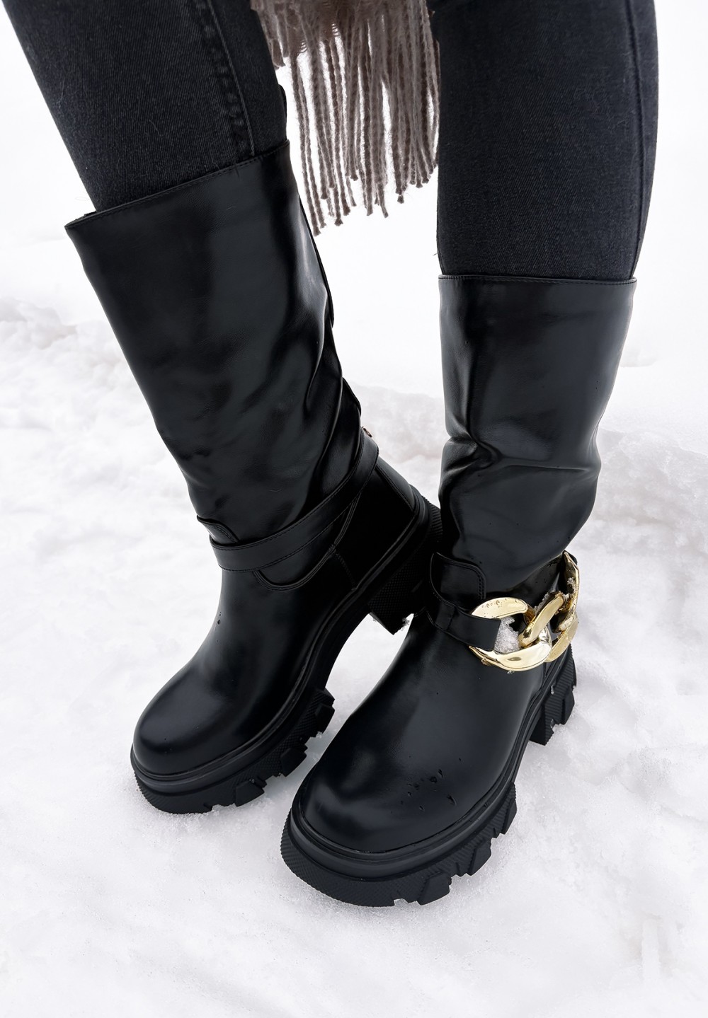 Wyraziste czarne kozaki, które idealnie wpisują się w zimowe i jesienne trendy. Model wykonany z gładkiego, matowego materiału prezentuje się elegancko, a jednocześnie nowocześnie. Masywna, traktorowa podeszwa zapewnia doskonałą przyczepność na śliskich nawierzchniach oraz stabilność podczas chodzenia. Ozdobny pasek z efektownym, złotym łańcuchem dodaje całości charakteru i modowego akcentu, który przyciąga wzrok. Cholewka o średniej wysokości dobrze dopasowuje się do nogi, gwarantując komfort noszenia nawet przez cały dzień. Kozaki świetnie sprawdzą się zarówno w casualowych, jak i bardziej odważnych stylizacjach.