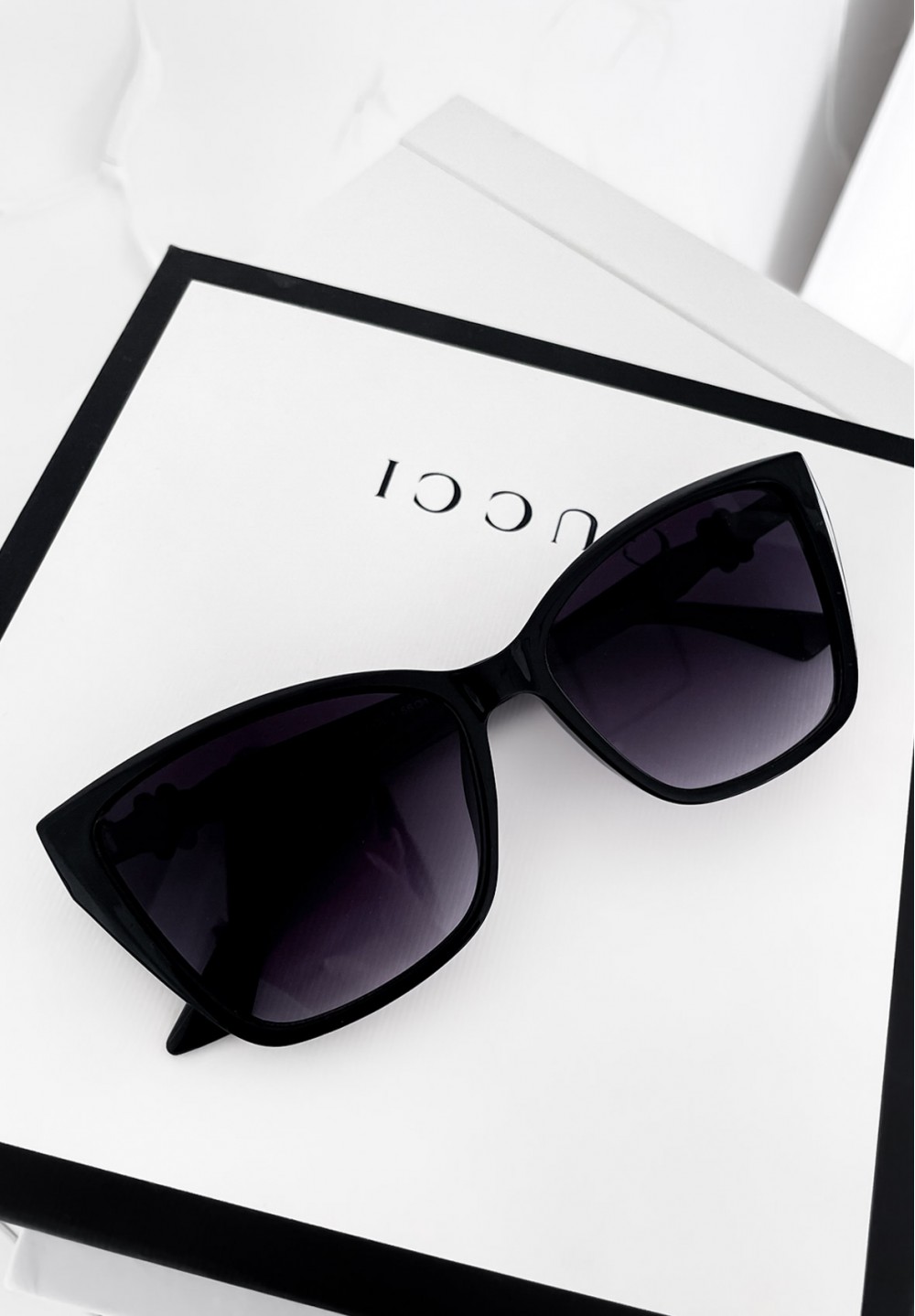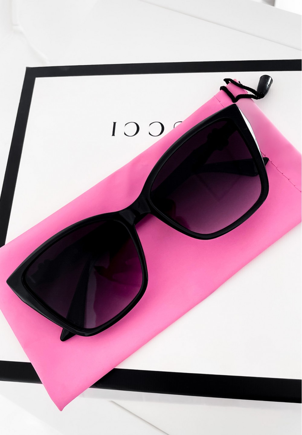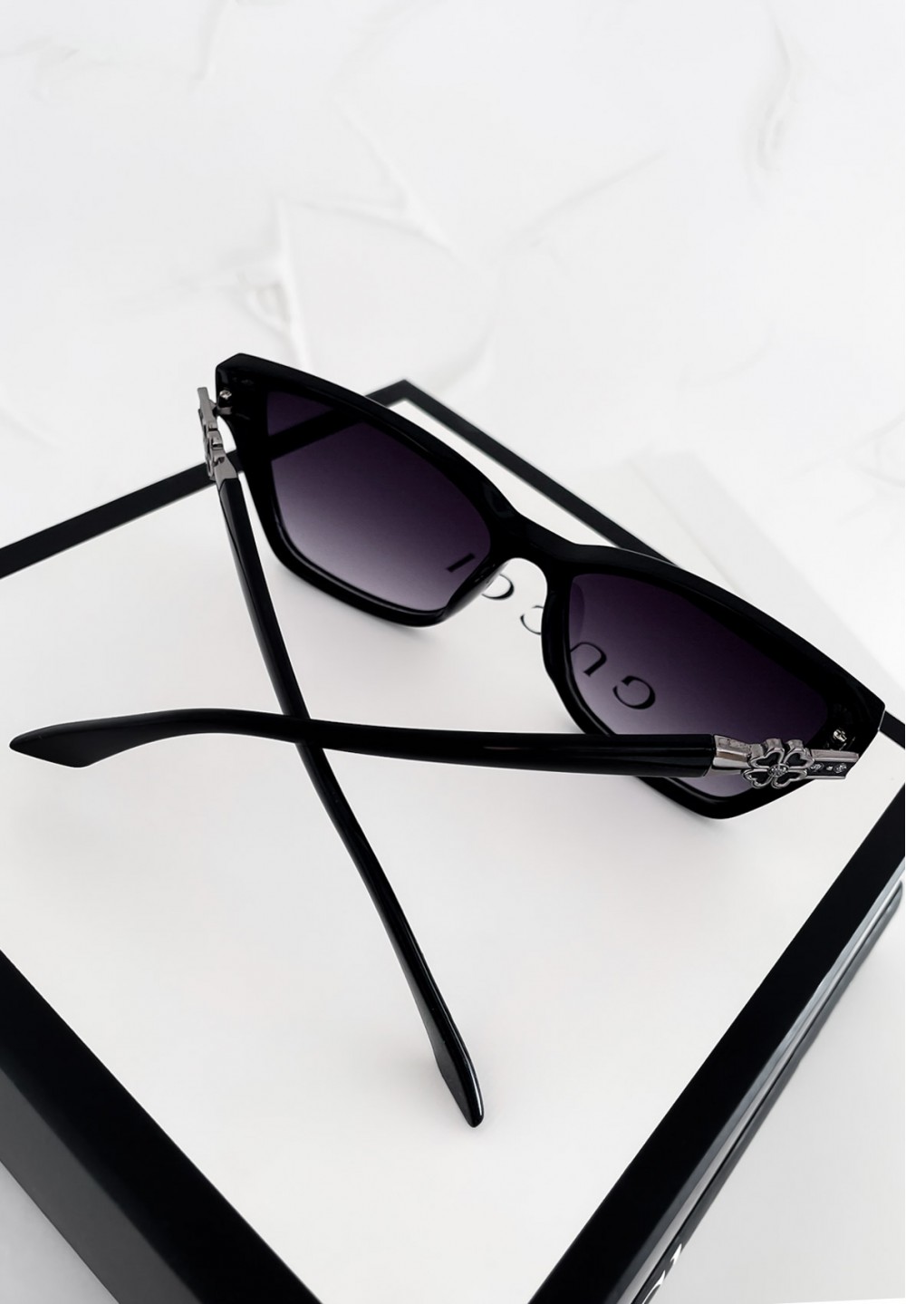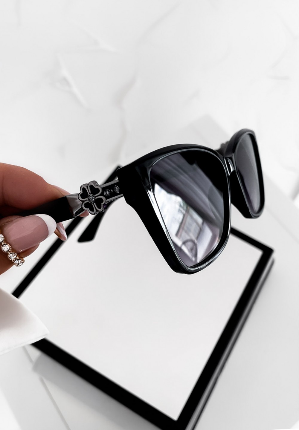 Te czarne okulary przeciwsłoneczne to połączenie kobiecego uroku i klasycznego stylu. Modny kształt kocich oczu nadaje im wyrazistego charakteru, idealnie podkreślając rysy twarzy. Na zausznikach znajduje się subtelna ozdoba w formie czarnego kwiatuszka. W zestawie dołączone jest materiałowe etui w różowym kolorze.