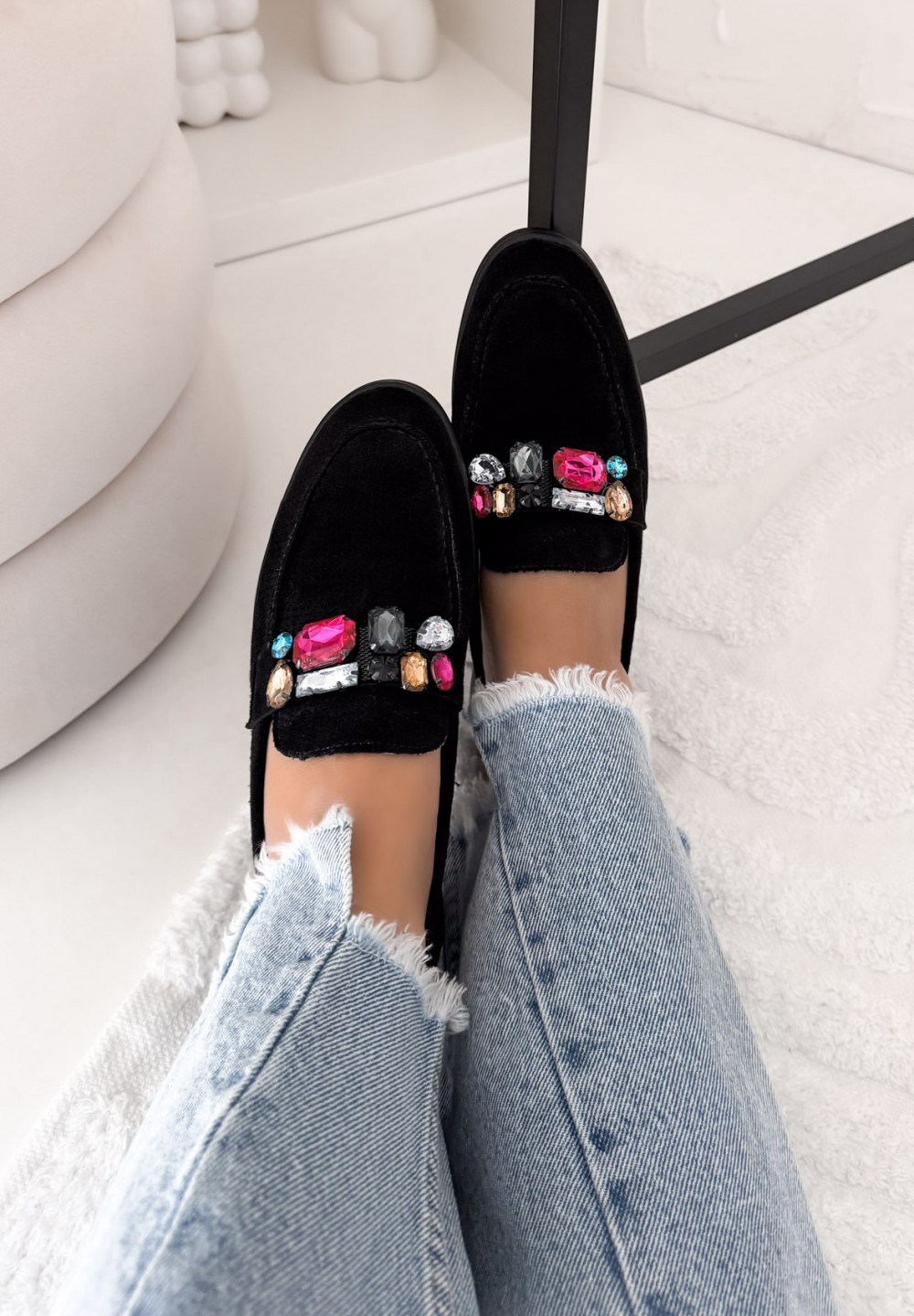 Dodaj stylowego akcentu do swojej garderoby dzięki naszym eleganckim mokasynom! Wykonane z miękkiego eko zamszu w klasycznym czarnym kolorze, zachwycają nie tylko wygodą, ale i wyjątkowym designem. Przód butów ozdobiony jest efektownymi, kolorowymi kamyczkami, które przyciągają spojrzenia i nadają obuwiu unikalnego charakteru. Wnętrze mokasyn wykończone jest wkładką z naturalnej skóry, która zapewnia komfort noszenia przez cały dzień.