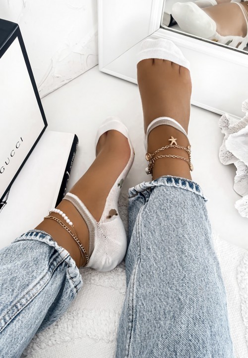 Te skarpetki typu stopki to idealne połączenie wygody i subtelnego uroku. Podeszwa wykonana jest z miękkiej, białej bawełny, na której wyszyte zostały kolorowe misie – radosny akcent, który przyciąga wzrok i dodaje skarpetkom wyjątkowego charakteru. Górna część skarpetek wykonana jest z przezroczystego, delikatnego tiulu, co sprawia, że całość wygląda lekko i kobieco. Doskonale sprawdzą się w cieplejsze dni oraz jako uroczy dodatek do letnich stylizacji.
