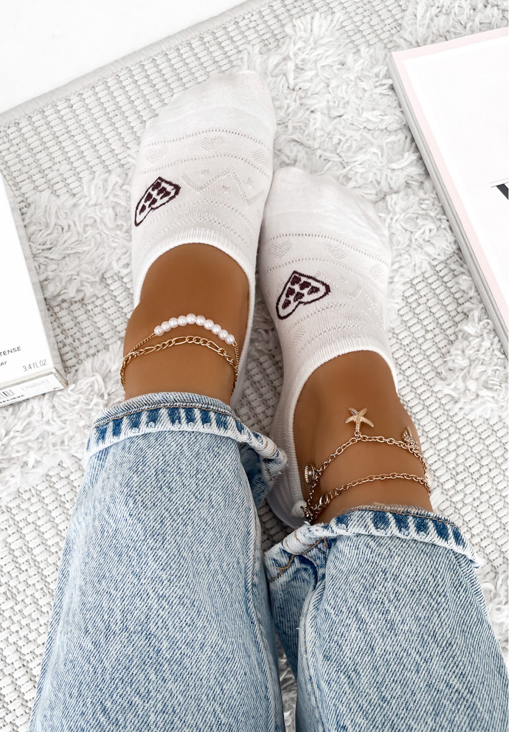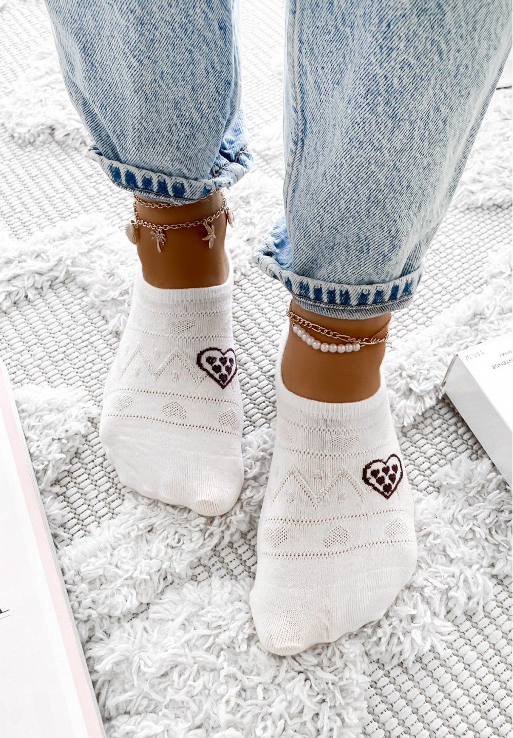Te białe skarpetki typu stopki to połączenie klasycznej formy i delikatnych detali. Wykonane w całości z miękkiej, oddychającej bawełny, zapewniają wygodę i komfort noszenia przez cały dzień. Całą powierzchnię zdobią subtelne, tłoczone wzorki, które dodają elegancji i lekkości. Po boku skarpetki znajduje się uroczy akcent – wyszywane czarne serduszko.