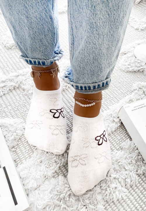Te białe skarpetki typu stopki to idealne połączenie klasycznej prostoty i delikatnego uroku. Wykonane z miękkiej, oddychającej bawełny, zapewniają komfort noszenia przez cały dzień. Całą powierzchnię zdobią subtelne, tłoczone wzorki, które dodają im lekkości i stylu. Z boku umieszczona została wyszywana wstążeczka w kolorze czarnym.