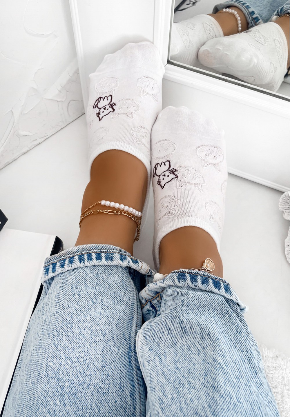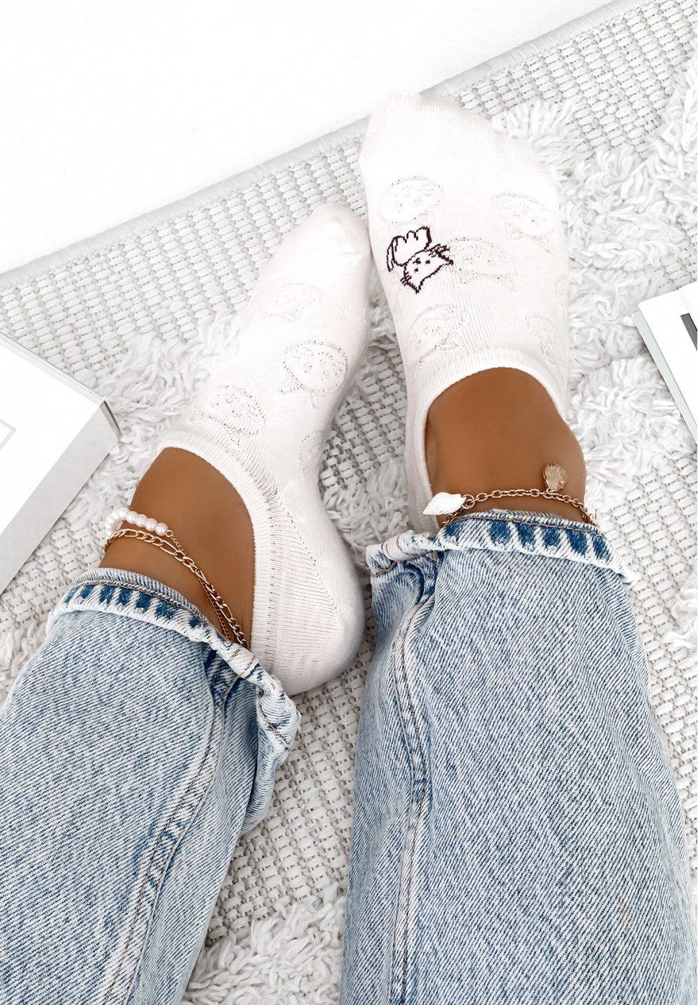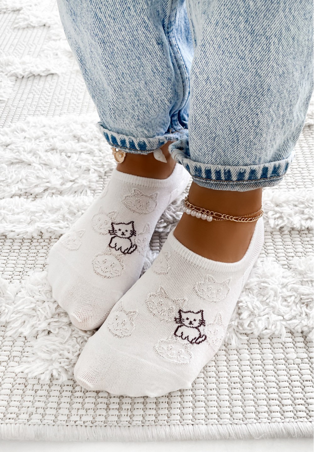 Te białe skarpetki typu stopki wykonane są z miękkiej, oddychającej bawełny, co gwarantuje wygodę i komfort noszenia przez cały dzień. Delikatne, tłoczone wzorki nadają im lekkości i elegancji. Z boku skarpetki umieszczono wyszywanego czarnego kotka.