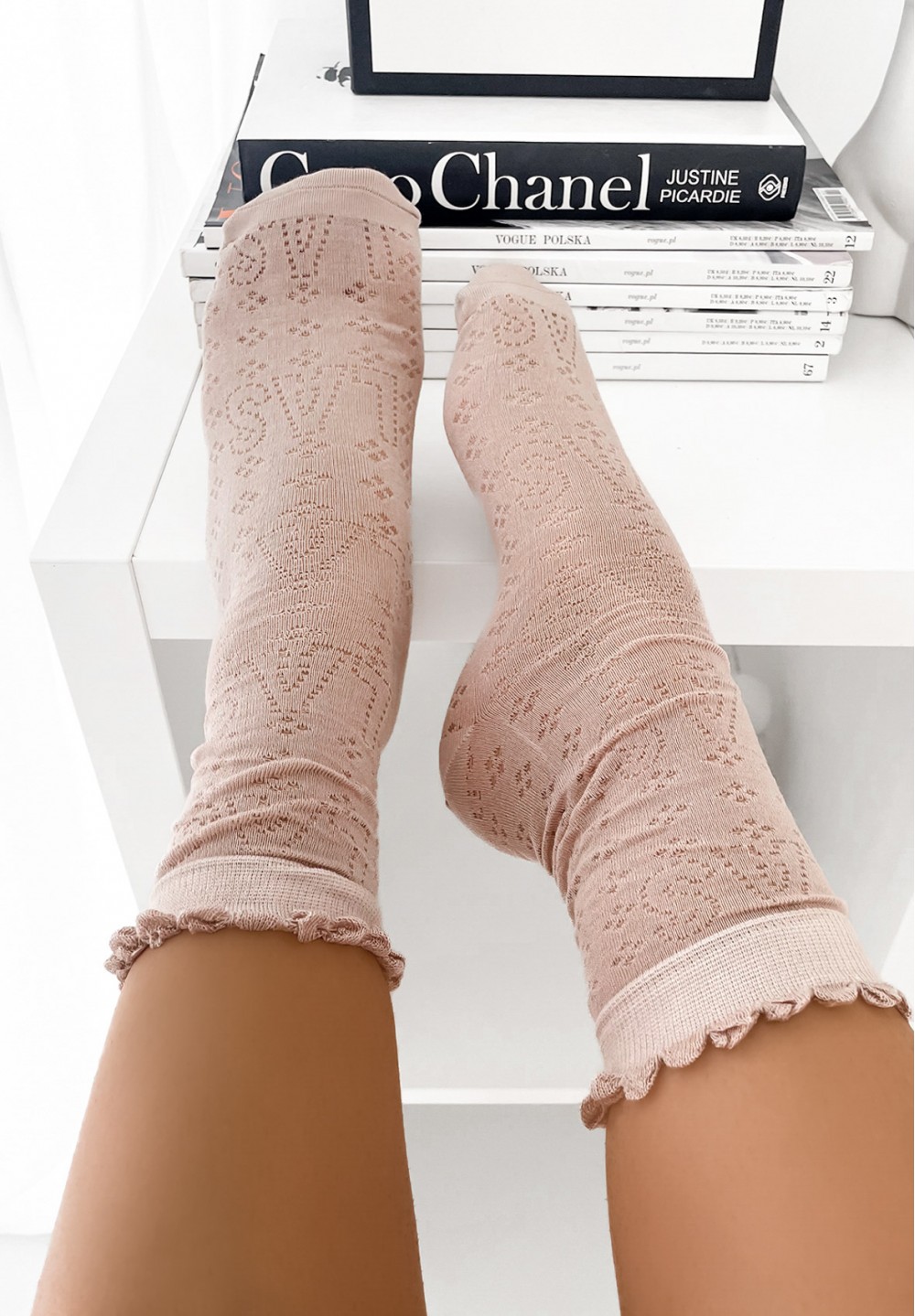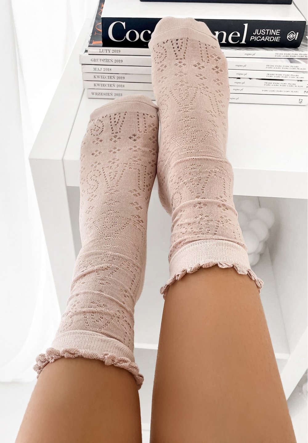 Te dłuższe skarpetki w subtelnym odcieniu beżu to uroczy dodatek do codziennych i wyjątkowych stylizacji. Zdobione są wzorkami z drobnych kropeczek, które układają się w kształt kwiatuszków, a ich środek wypełniony jest lekkim, przezroczystym tiulem. Górna część została estetycznie wykończona, co nadaje całości elegancji i sprawia, że idealnie prezentują się zarówno z balerinkami, jak i półbutami.