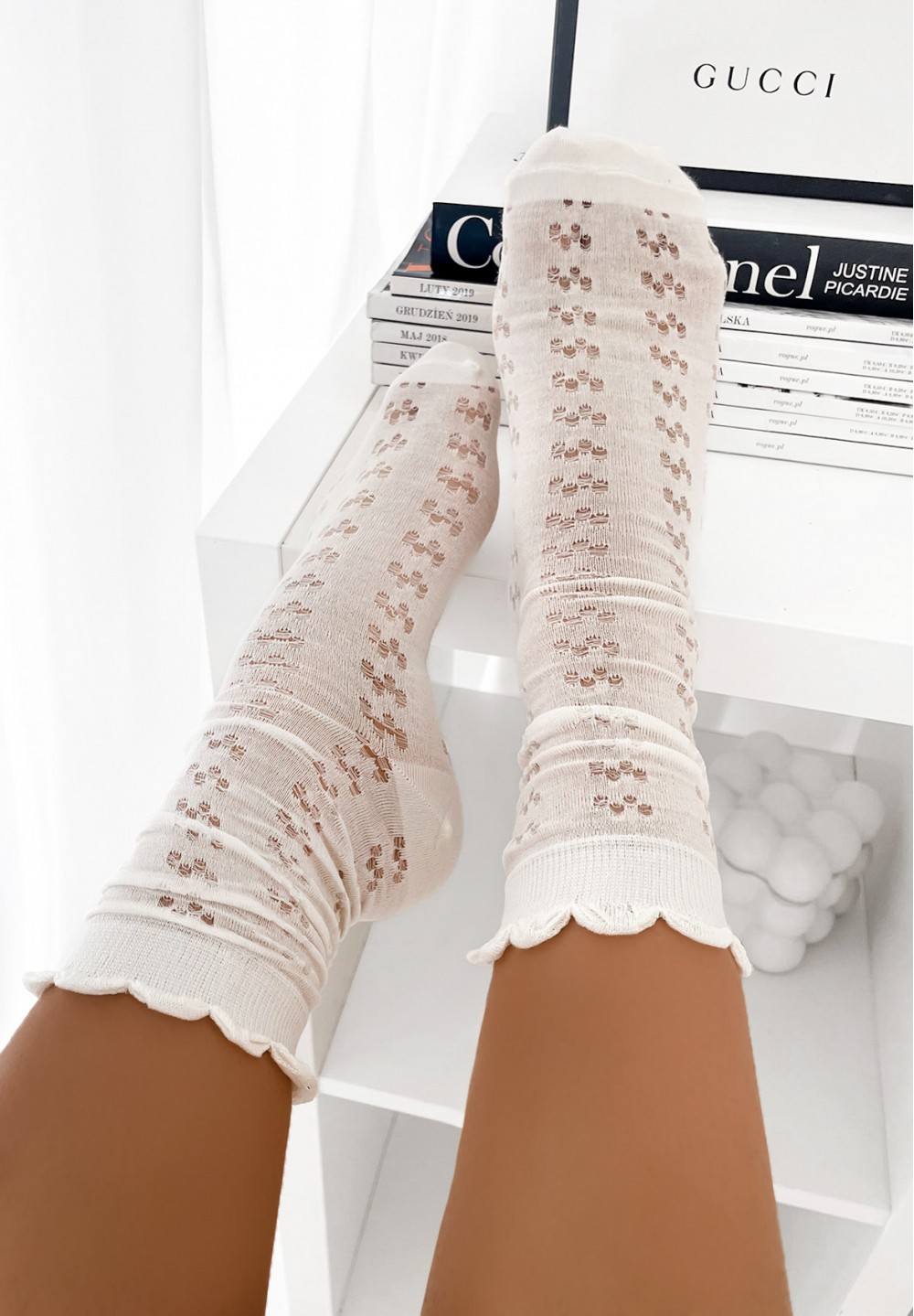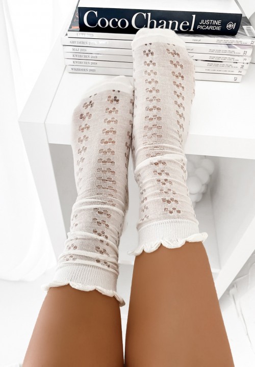 Te dłuższe skarpetki w klasycznym białym kolorze zachwycają delikatnym wzorem i starannym wykończeniem. Zdobione są drobnymi kropeczkami, których wnętrze wypełniono subtelnym, przezroczystym tiulem – to efektowny detal, który dodaje całości lekkości i dziewczęcego uroku. Górna część skarpetek została pięknie wykończona falowanym brzegiem, co nadaje im elegancki wygląd i sprawia, że doskonale komponują się z sukienkami, spódniczkami czy balerinkami.