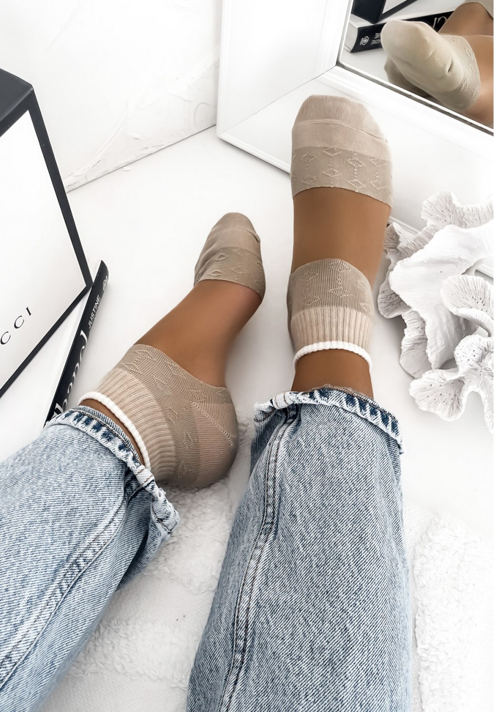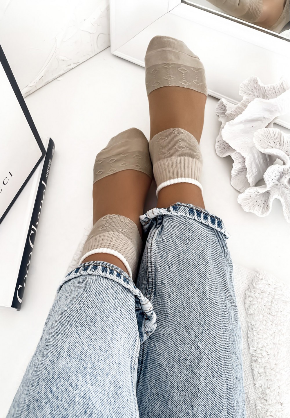 Delikatne i stylowe skarpetki, które łączą komfort bawełny z lekkością tiulu. Palce oraz pięty wykonane są z miękkiej bawełny ozdobionej tłoczonymi wzorkami, co dodaje im elegancji i uroku. Środkowa część skarpetki wykonana jest z przezroczystego tiulu, który nadaje całości lekkości i subtelności. Górę zdobi prosty, biały pasek, który stanowi estetyczne wykończenie i dodaje nowoczesnego charakteru. Idealne do balerinek, mokasynów czy jako delikatny akcent w codziennych stylizacjach.