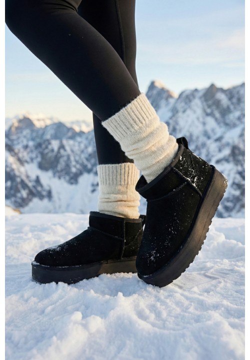 Stylowe czarne śniegowce wykonane z miękkiego eko zamszu to idealny wybór na chłodne dni. Osadzone na wygodnej platformie, zapewniają komfort i świetną izolację od podłoża. Wnętrze wyścielone jest przyjemnym, mięciutkim i ciepłym ociepleniem, które gwarantuje maksymalną wygodę nawet podczas mroźnej pogody. Model z krótką cholewką doskonale komponuje się z zimowymi stylizacjami, dodając im przytulnego, modnego charakteru.