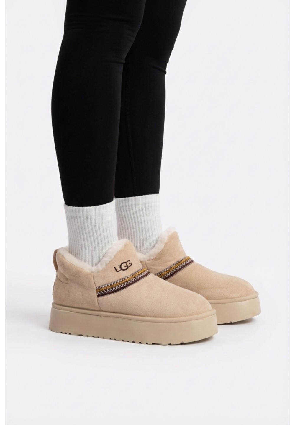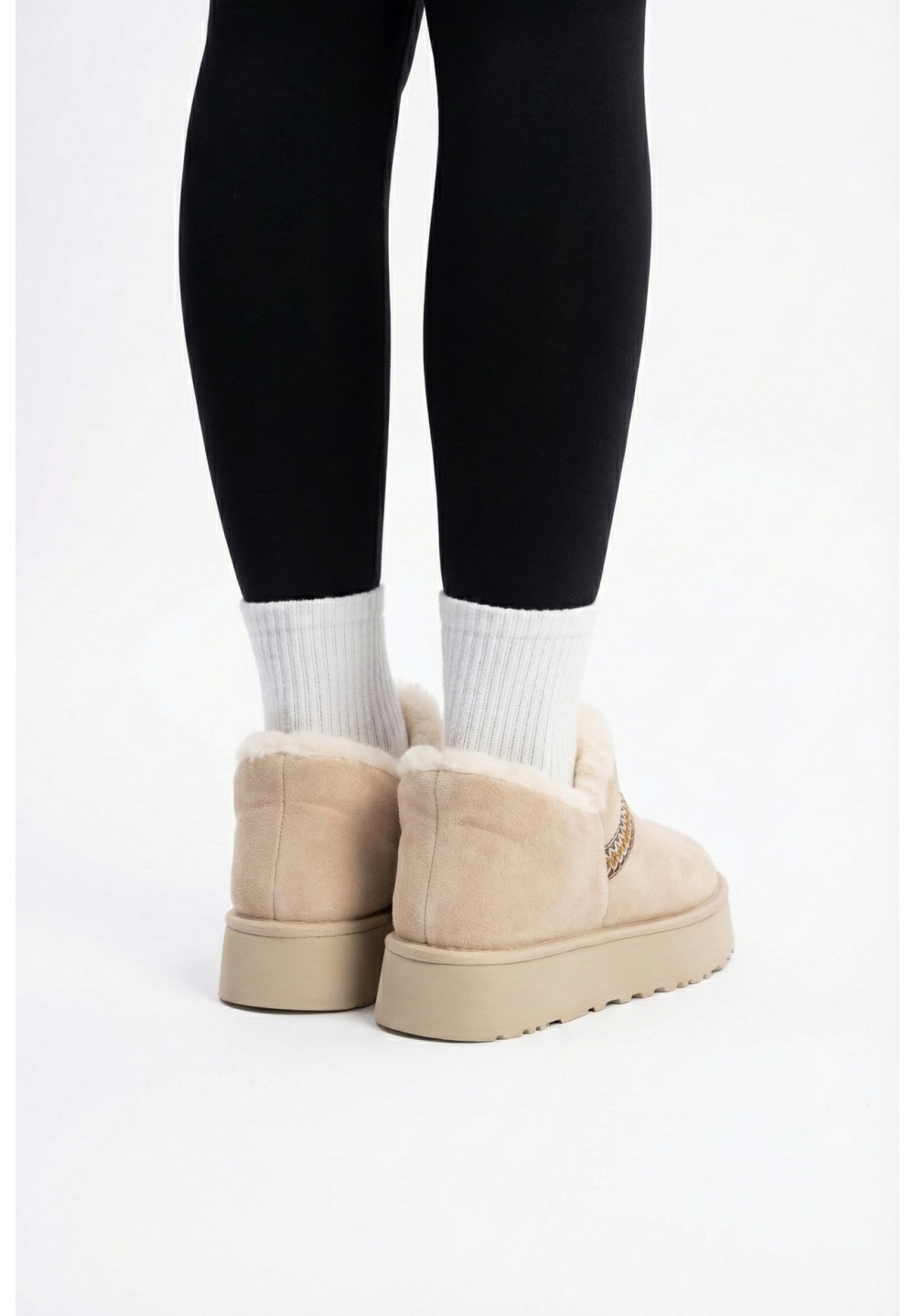 Miękkie, ocieplane botki zimowe z dekoracyjnym pasem i grubą, izolującą podeszwą. Wnętrze wyłożone puszystym futerkiem zapewnia ciepło i wygodę, a zamszowy materiał nadaje im stylowy, zimowy charakter. Idealne na śnieżne dni.