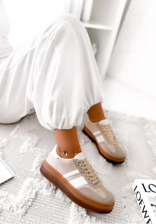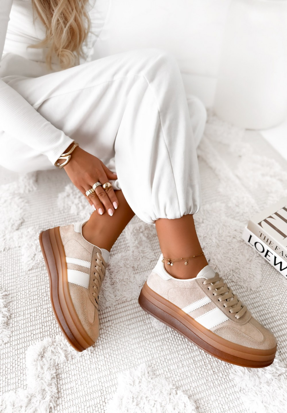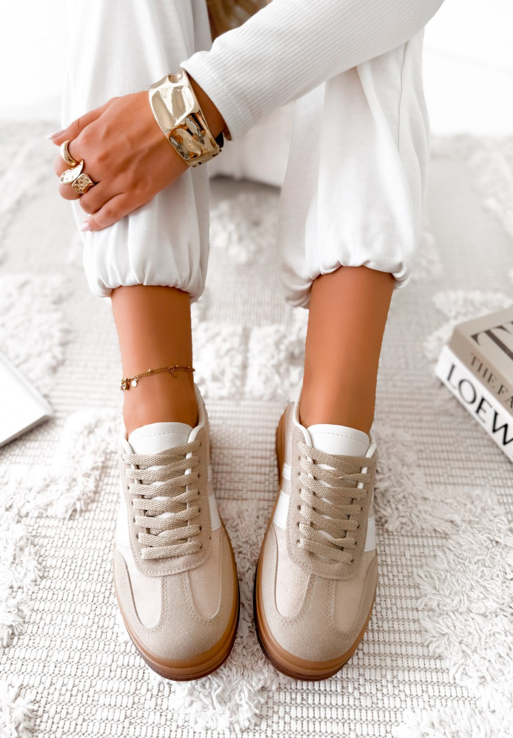 Nowoczesny design i komfort w jednym. Te beżowe trampki typu sneakersy wykonane są z przyjemnego w dotyku eko zamszu, który nadaje im stylowego, matowego wykończenia. Po bokach i z tyłu znajdują się kontrastujące, białe wstawki z eko skóry, które dodają całości charakteru i lekkości. Całość osadzona jest na elastycznej, pomarańczowej gumowej podeszwie, która nie tylko przyciąga wzrok, ale też zapewnia świetną przyczepność i wygodę podczas chodzenia. Idealne do miejskich stylizacji – od casualowych po sportowo-eleganckie.