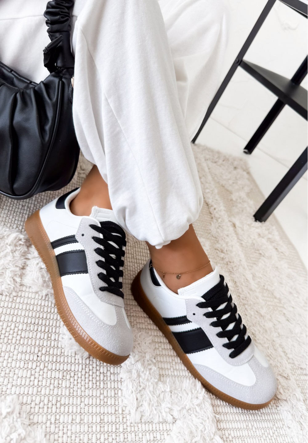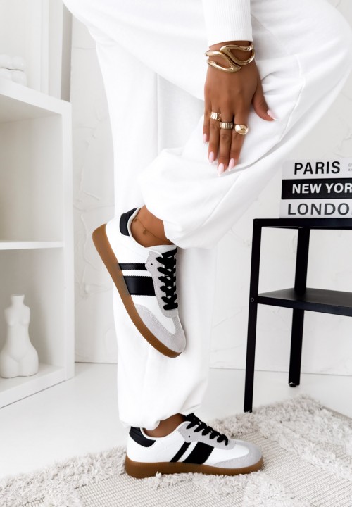Wyjątkowy design i komfort na co dzień. Te białe sneakersy wyróżniają się nowoczesnym stylem i oryginalnym zestawieniem kolorów. Z przodu znajdują się beżowe wstawki z miękkiego eko zamszu, które dodają butom eleganckiego charakteru, a czarne akcenty po bokach i z tyłu podkreślają ich dynamiczny wygląd. Długi, wyciągany język nadaje całości modowego sznytu i pozwala dopasować fason do różnych stylizacji. Całość dopełnia elastyczna, pomarańczowa gumowa podeszwa, która zapewnia dobrą przyczepność i ożywia cały look. Idealne na co dzień – dla tych, którzy lubią wyróżniać się z tłumu.